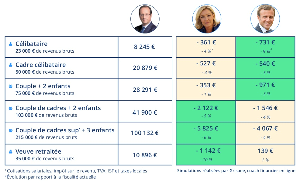 Baisse du barème IR pour Le Pen, Suppression de cotisations pour Macron